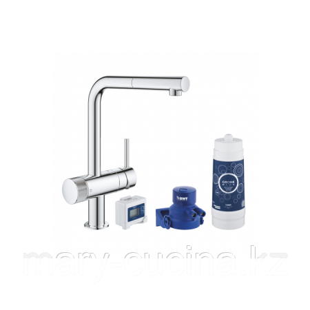 смеситель для мойки с функцией очистки водопроводной воды, с выдвижным изливом, керамический картридж 46 мм, диапазон поворота 90°, раздельные водотоки внутри излива, фильтр для воды и счетчик входят в комплект, ресурс фильтра 3000 литров, цвет хром, пр-во Португалия